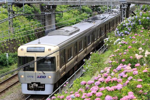 新代田駅改札を出たらファミリーマートのある方の横断歩道を渡り堀割沿いの道を進んで最初の跨線橋が撮影地。徒歩3分。井の頭線沿線であじさいが咲く時期限定の撮影地で、渋谷方面行き電車が撮影可能。ただし晴天だと影が伸びるので曇っている方が撮影しやす…