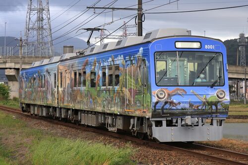 撮影地 えちぜん鉄道勝山永平寺線 越前島橋〜観音町間 えちぜん鉄道MC8000形は元静岡鉄道1010編成。外装ラッピングだけでなく、内装もラッピングや座席交換を施して"恐竜列車"となった。ついでに集電装置もシングルアーム式へ交換されている。 勝山にある恐…